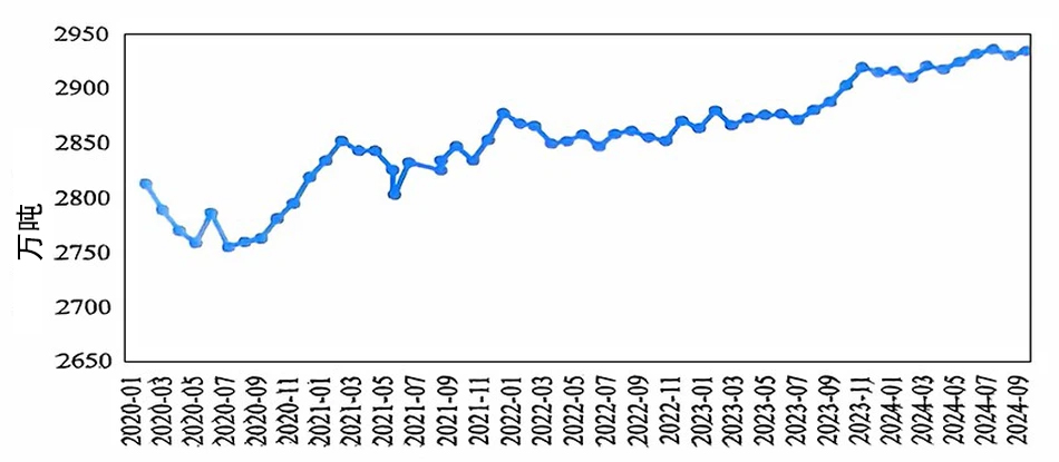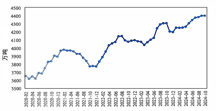 2024年10月,國(guó)內(nèi)電解鋁繼續(xù)保持穩(wěn)定生產(chǎn)。10月國(guó)內(nèi)電解鋁建成產(chǎn)能4462萬(wàn)噸/年,運(yùn)行產(chǎn)能4363萬(wàn)噸/年,較上月增加12萬(wàn)噸/年,主要因?yàn)樗拇、貴州等地技改產(chǎn)能逐步復(fù)產(chǎn)及新疆置換項(xiàng)目啟槽。本月開(kāi)工率約98%,為歷史新高。10月份產(chǎn)量為373萬(wàn)噸,環(huán)比增長(zhǎng)3.4%,同比增長(zhǎng)2.1%,日均產(chǎn)量12.0萬(wàn)噸,環(huán)比持平。