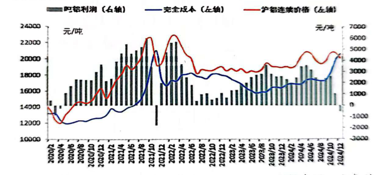 2024年,盡管氧化鋁價格大幅波動導(dǎo)致電解鋁成本重心明顯抬升,但從全年來看,鋁價持續(xù)高位運行,電解鋁行業(yè)依舊維持2000元/噸以上的利潤,尤其是在5月份,利潤達到3581元/噸的年內(nèi)最高水平。根據(jù)安泰科測算,2024年中國電解鋁加權(quán)平均完全成本(含稅)為17717元/噸,同比增加7.4%或1223元/噸;全年噸鋁平均利潤約為2227元,同比增加0.9%或20元。