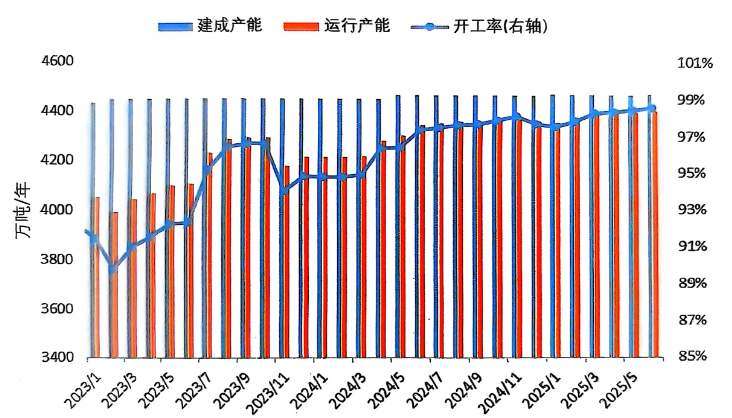 2025上半年,中國鋁行業(yè)生產(chǎn)總體較為穩(wěn)定,沒有出現(xiàn)因各種不可抗力因素導(dǎo)致的規(guī)模化減產(chǎn),且隨著四川、貴州、青海等省/區(qū)電解鋁企業(yè)的復(fù)產(chǎn)和新建項(xiàng)目投產(chǎn),上半年生產(chǎn)能力得到持續(xù)提升。安泰科統(tǒng)計(jì),截至2025年6月底,中國電解鋁建成產(chǎn)能4470萬噸/年,其中運(yùn)行產(chǎn)能4405萬噸/年,較2024年底增加49萬噸。1-6月份產(chǎn)能利用率達(dá)98.1%,不斷刷新歷史新高,比去年同期高2.4個(gè)百分點(diǎn):其中6月份產(chǎn)能利用率達(dá)98.5%,較2024年末高0.9個(gè)百分點(diǎn)。2025上半年,中國電解鋁產(chǎn)量約為2184萬噸,同比增加2.4%。