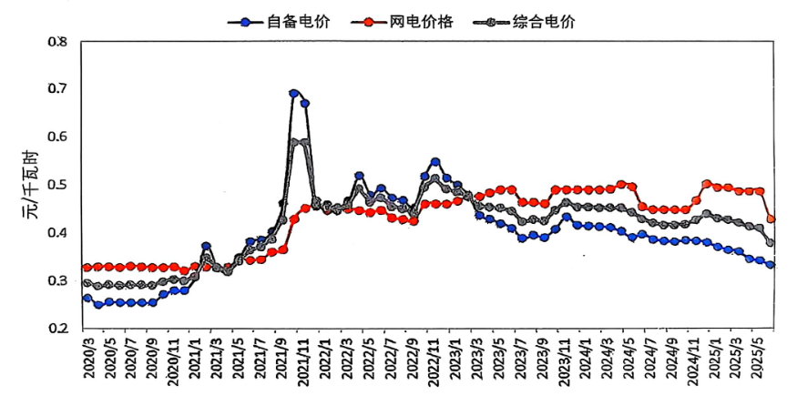 電力成本下降。截至6月底,中國電解鋁運(yùn)行產(chǎn)能中的自備電比例約55%;網(wǎng)電比例約45%。煤炭價(jià)格的持續(xù)下滑導(dǎo)致鋁企自備電價(jià)降低是2025年以來電解鋁行業(yè)電力成本下降的主要原因。2025年以來,煤炭主產(chǎn)區(qū)煤礦復(fù)產(chǎn)節(jié)奏加快,進(jìn)口煤到港量維持高位;而電煤因暖冬影響需求疲軟,非電行業(yè)又處于淡季,煤炭供應(yīng)寬松但需求疲軟,導(dǎo)致煤炭價(jià)格呈下行態(tài)勢,鋁廠自備電價(jià)逐步下跌。此外,廣西、云南、四川等地區(qū)網(wǎng)電價(jià)格均有不同程度的下調(diào),進(jìn)一步促進(jìn)了鋁企電力成本的下降。根據(jù)安泰科統(tǒng)計(jì),2025年6月份自備電加權(quán)平均價(jià)格為0.332元/千瓦時(shí),較2024年末下降0.048元/千瓦時(shí),較2024年同期下降0.065元/千瓦時(shí);網(wǎng)電價(jià)格為0.428元/千瓦時(shí),較2024年末下降0.074元/千瓦時(shí),較2024年同期下降0.0276元/千瓦時(shí);綜合加權(quán)平均電價(jià)為0.379元/千瓦時(shí),較2024年末下降0.0507元/千瓦時(shí)。1-6月份綜合加權(quán)平均電價(jià)為0.414元/千瓦時(shí),同比下降0.034元/千瓦時(shí)。