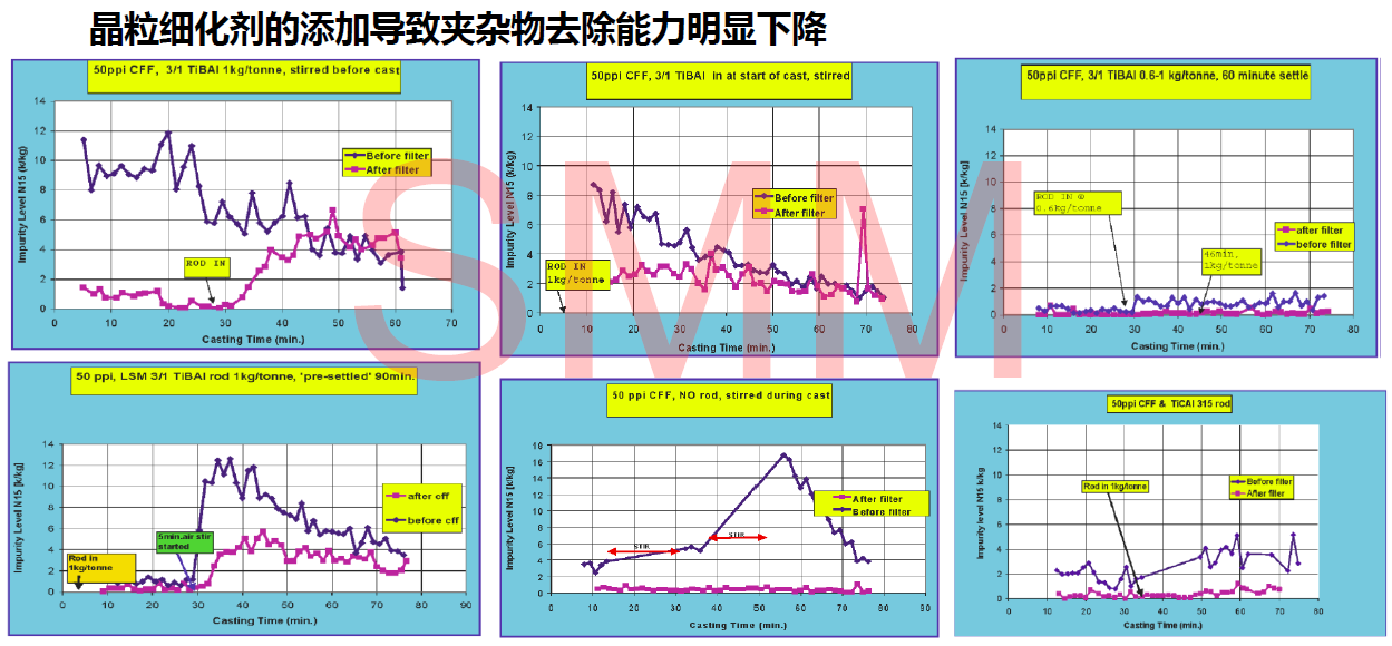 據(jù)丁總調(diào)查顯示,常用細化劑會對CFF過濾器的過濾性能產(chǎn)生負面影響,并隨較高的添加速率而惡化,并顯示晶粒細化劑種類對過濾性能影響不同。據(jù)業(yè)內(nèi)相關試驗調(diào)查,鋁鈦碳或因無TiB2,從而減少對CFF過濾器的吸附、堵塞,會大大降低細化劑對過濾器性能的影響。